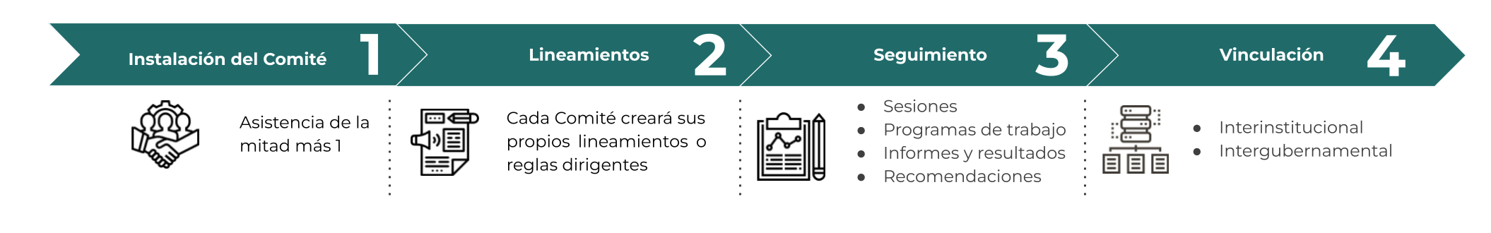 Los Comités Operativos, surgieron de los 7 elementos de una vivienda adecuada señalados por ONU-Hábitat y tienen como objetivo impulsar la creación de proyectos y programas que contribuyan a la conducción e implementación de la Política Nacional de Vivienda. En la Primera Sesión Ordinaria 2022 del Consejo Nacional de Vivienda, se aprobaron los siguientes Comités: